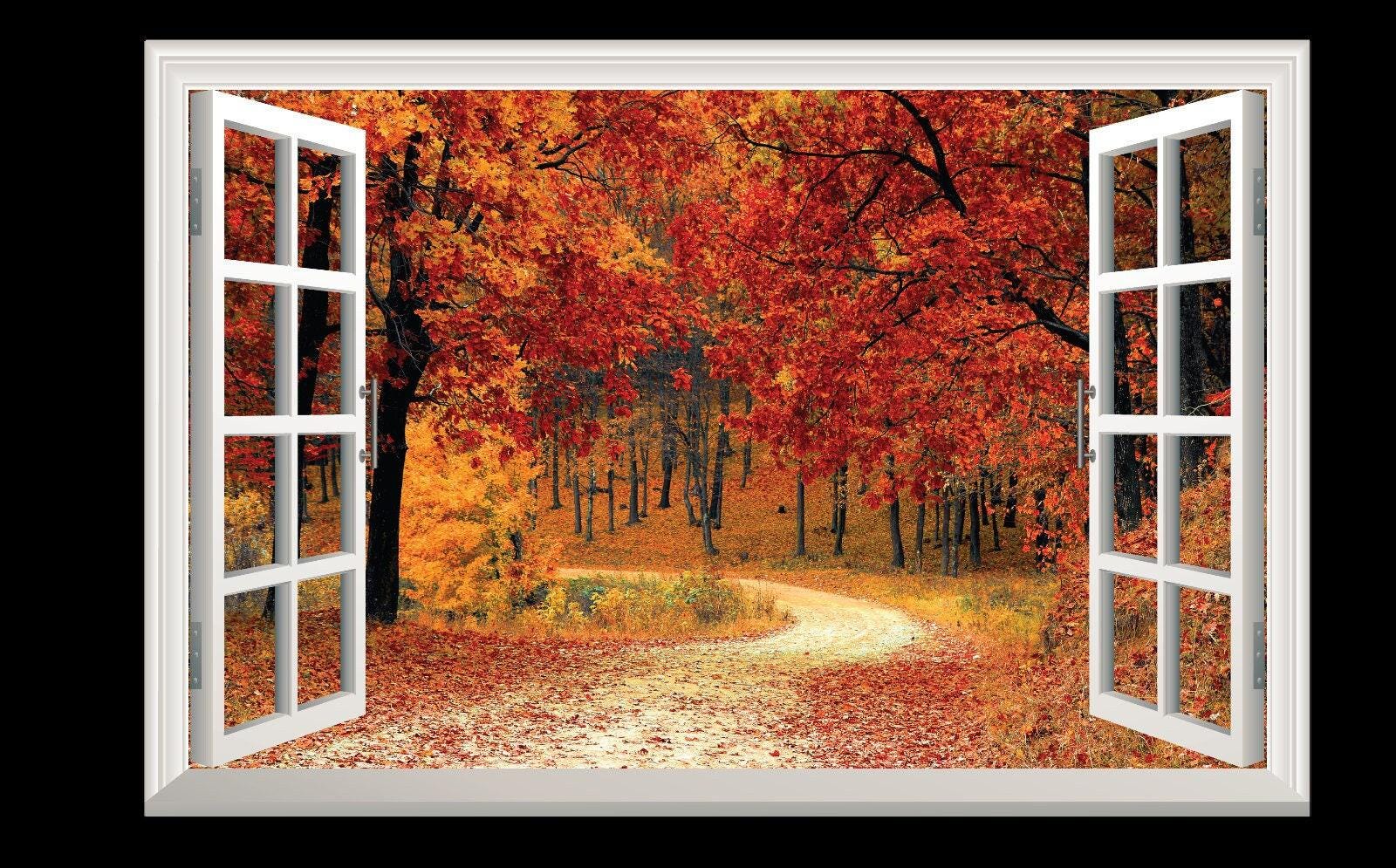 Autumn Forest Window View Wall Decal: Self-Adhesive Vinyl Mural