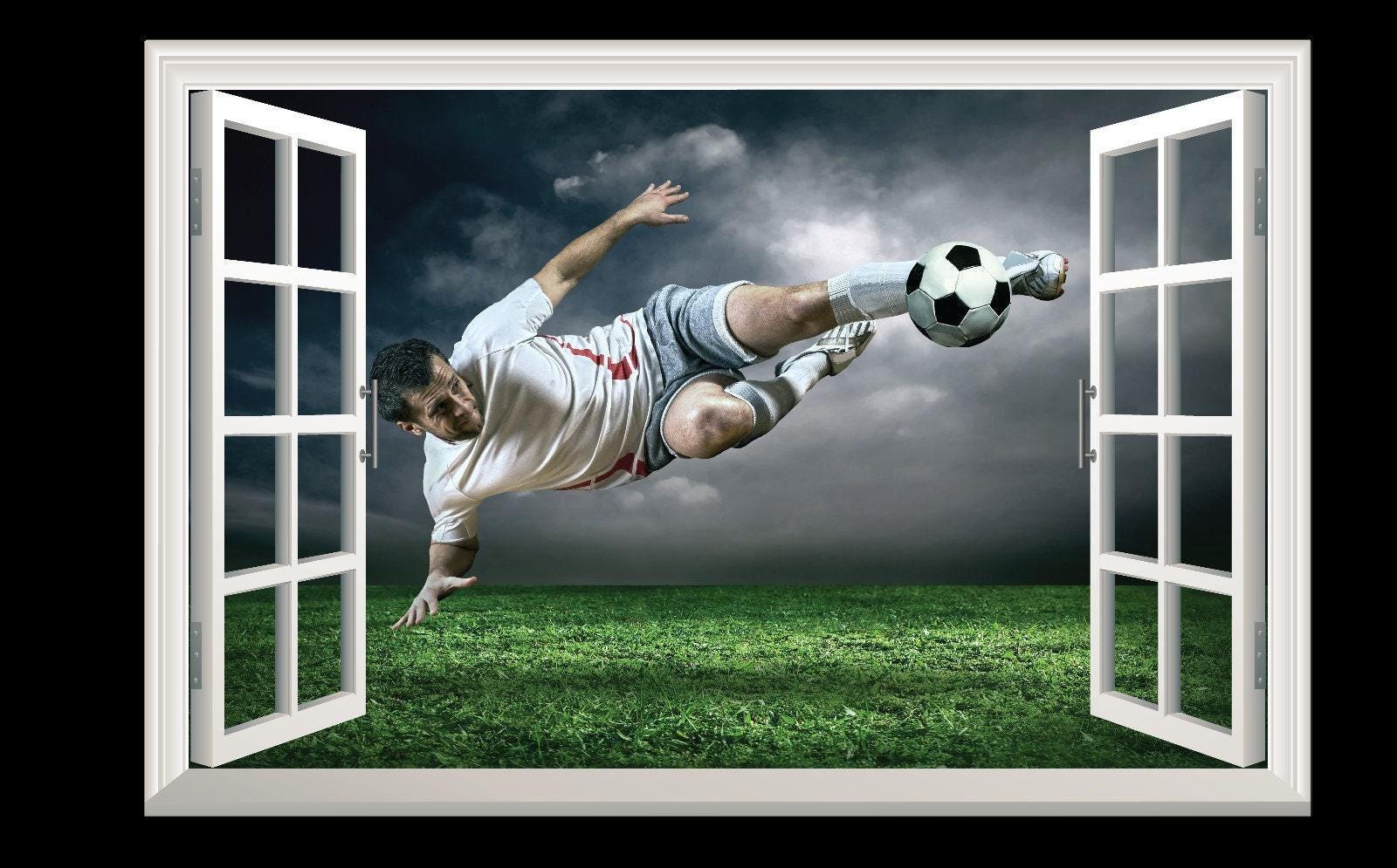 Footballer 3D Window View Wall Decal: Boys Bedroom Mural