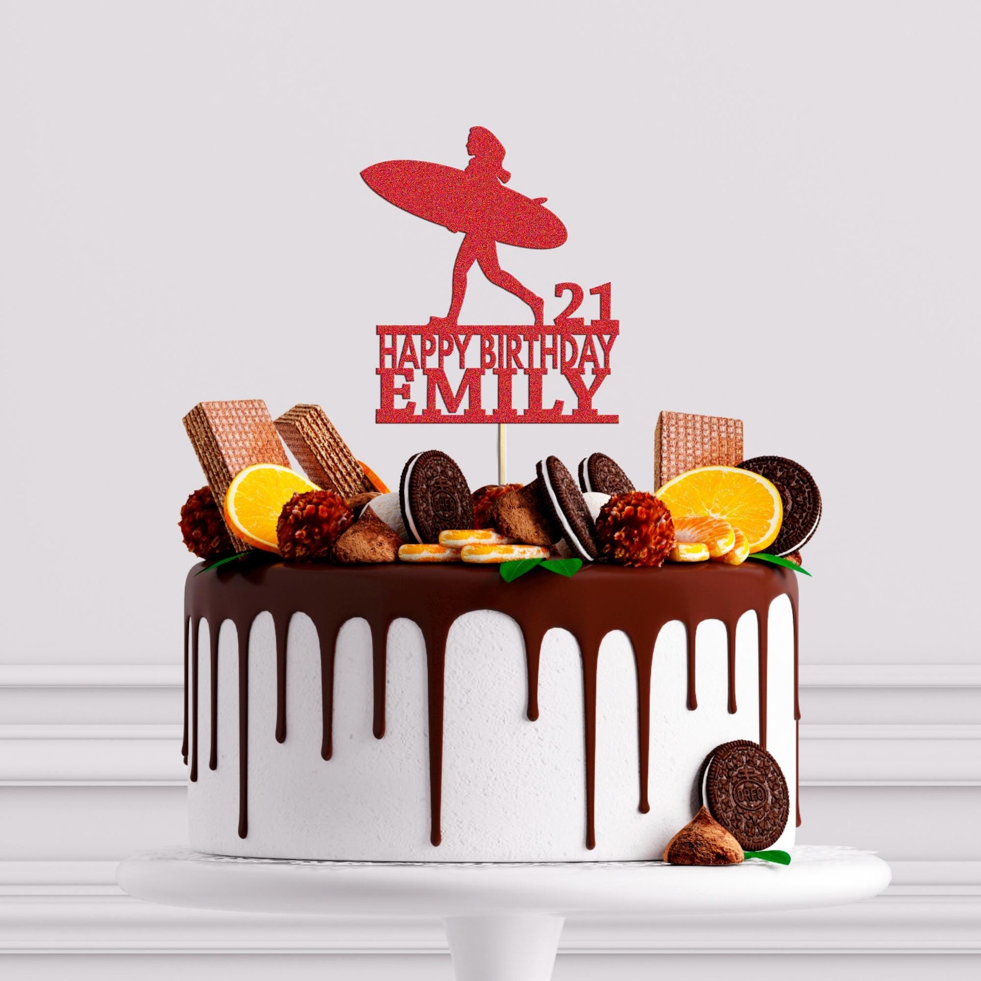 Personalised Surfboard Glitter Cake Topper: Girl's Birthday Decoration