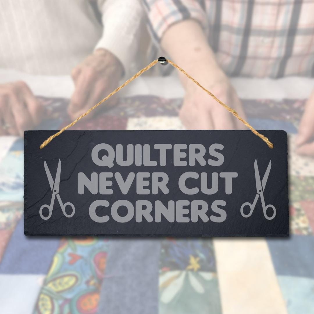 Quilters Never Cuts Corners Laser Engraved Hanging Slate Tailor Plaque Sign