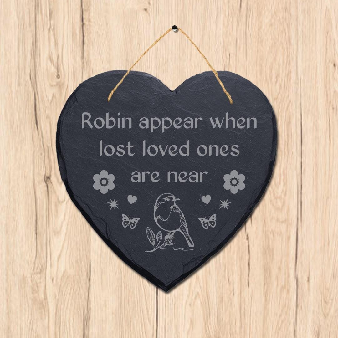 Robin Appear When Lost Loved Engraved Hanging Memorial Heart Shape Slate Sign