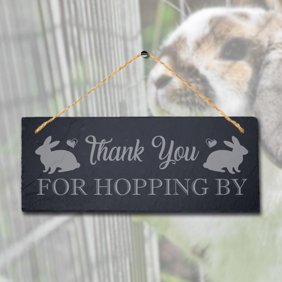 Thank You For Hopping By Laser Engraved Hanging Slate Rabbit Bunny Plaque Sign