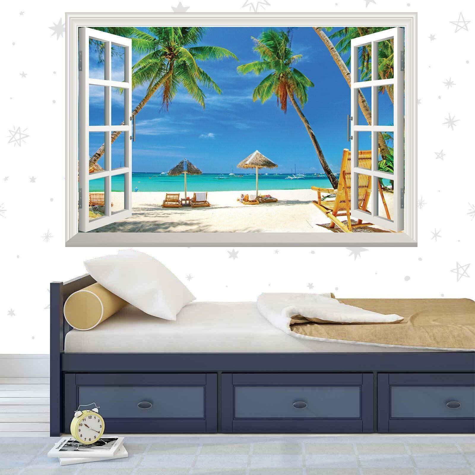 Tropical Beach Window View Wall Sticker: Palm Trees, Blue Sky