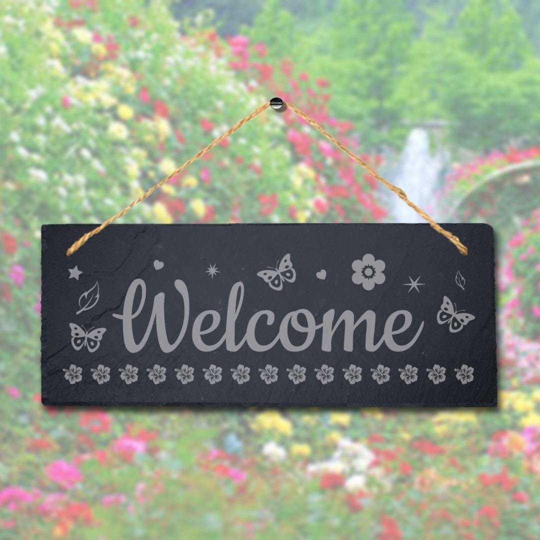 Welcome Butterfly Pattern Laser Engraved Hanging Slate Home Decor Plaque Sign