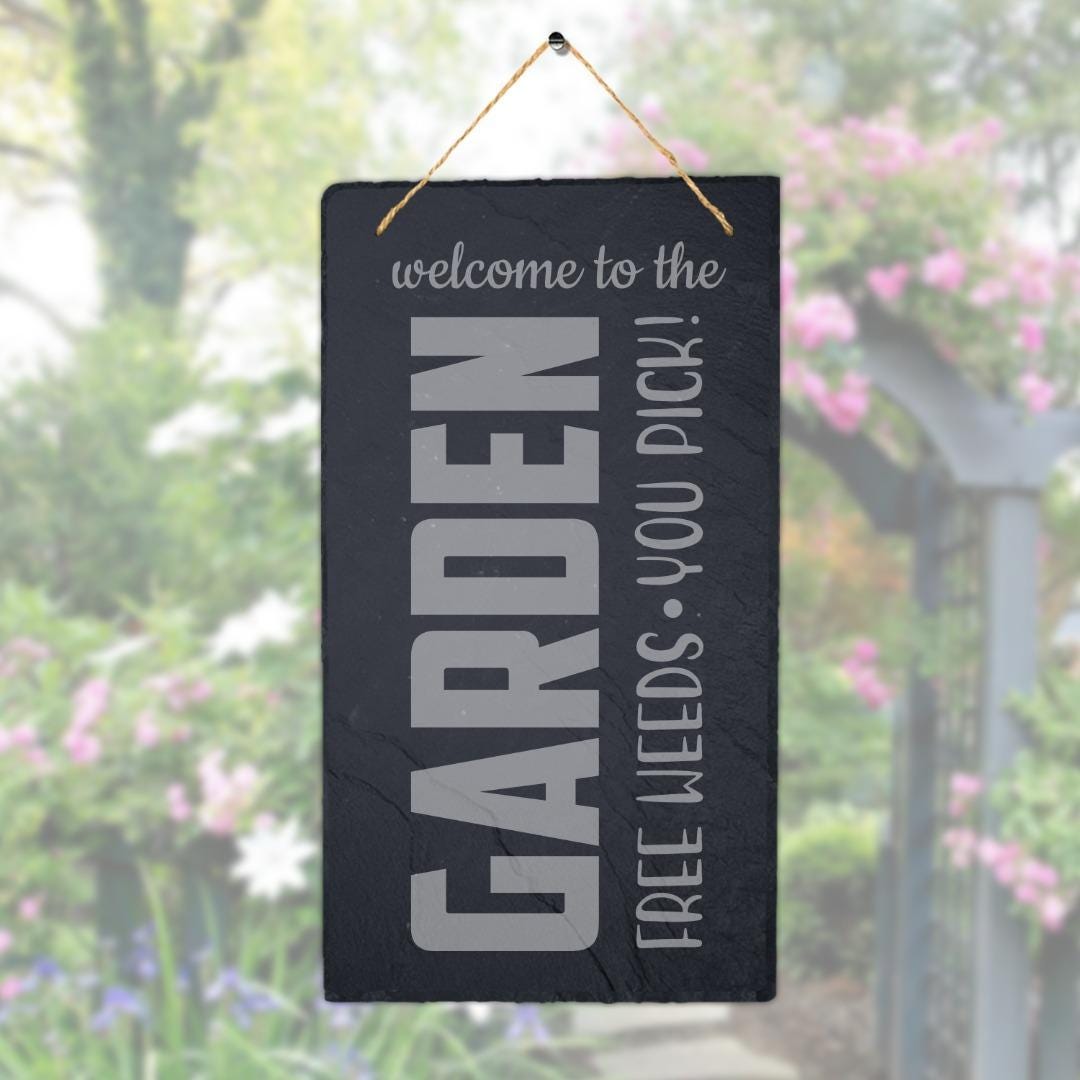 Welcome Hanging Slate Sign Engraved Plaque Weeds You Pick Garden Home Art Gift